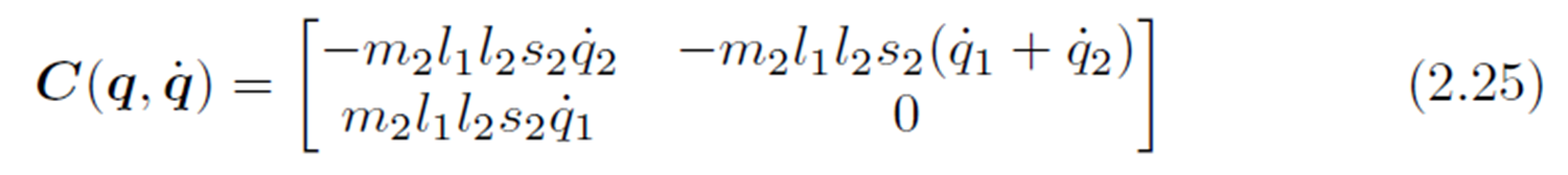 코리올리 및 구심력 벡터로부터 행렬 $C(q, \dot{q})$와 속도벡터 $\dot{q}$을 분리하는 방법이 무수히 많으므로, 크리스토펠 심볼 식을 이용하여 $C(q, \dot{q})$의 유일한 형태를 찾을 수 있습니다(참고사항).