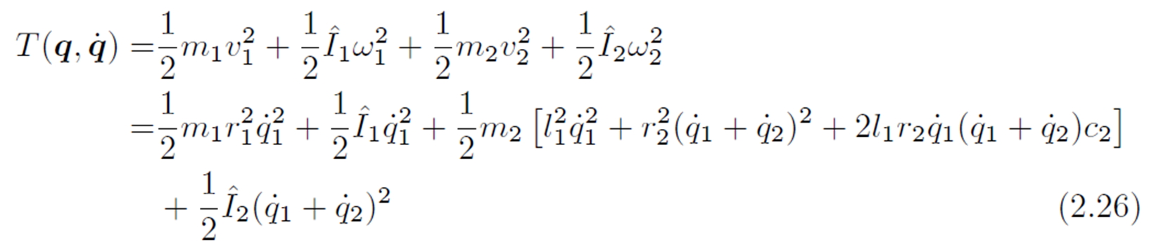 - 점질량 $m_2$의 운동속도: $v_2=\sqrt{l^2_1q^2_1+l^2_2(\dot{q_1}+\dot{q_2})^2+2l_1l_2\dot{q_1}(\dot{q_1}+\dot{q_2})cos(q_2)}$