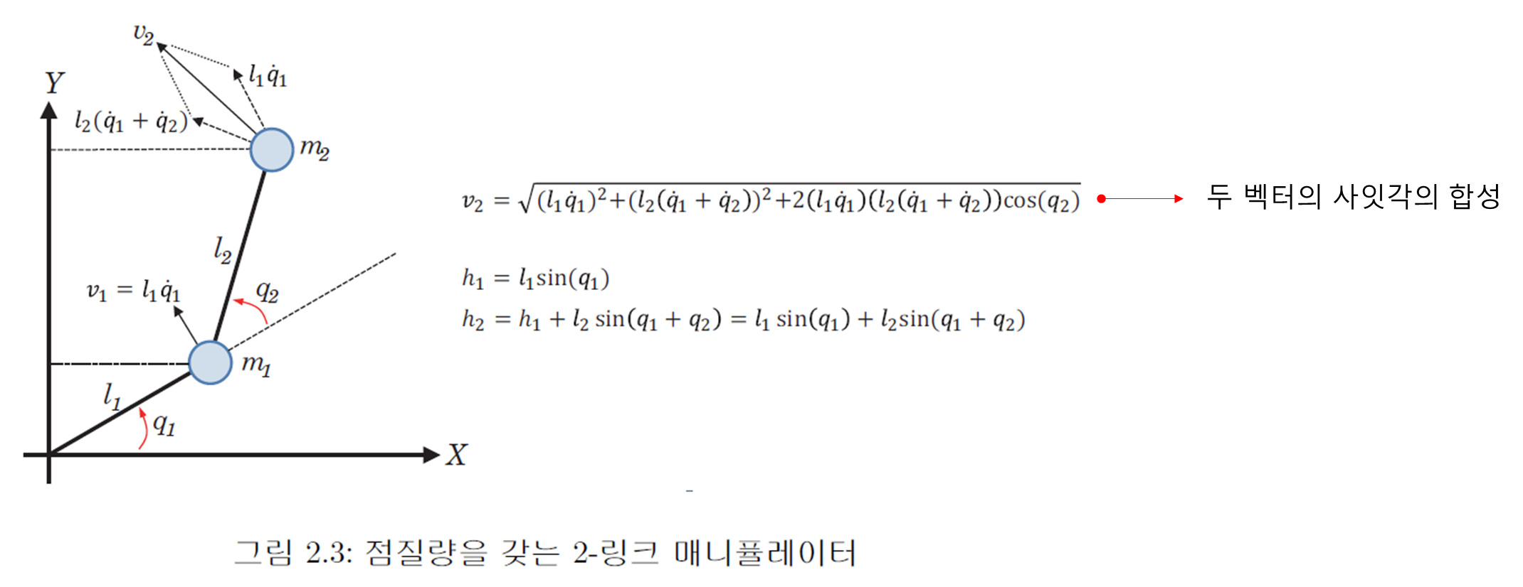 - $m_2$의 경우 $l_2$에 수직방향을 구속된 $l_2(\dot{q_1}+\dot{q_2})$의 속도벡터와 $l_2$에서 $l_2$로 전달되는 $v_1$벡터의 합성 벡터의 크기로 얻어진다.