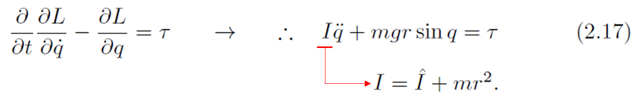 지금까지 유도한 식을 간단하게 정리하고, 최종적으로 식(2.3)을 적용하여 1 링크 로봇 동역학 모델을 다음과 같이 정의할 수 있습니다.