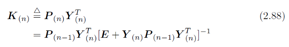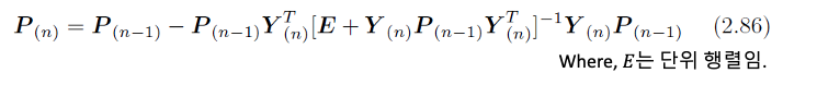 최적화 해 식 (2.83)을 recursive의 방법으로 구현할 수도 있으며, 이는 가장 단순한 현태의 칼만 필터 유도과정이라고 할 수 있으며, 그 첫 단계로 다음의 역행렬을 정의합니다.