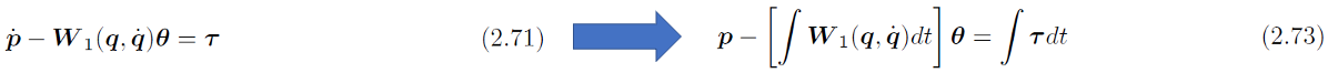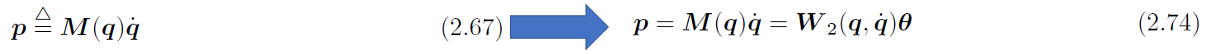 이때 $\dot{M}=C+C^T$라는 성질을 적용하면, $\dot{p}=C^T(q, \dot{q})\dot{q}-g(q)-d+\tau (2.70)$ 으로 정리 할 수 있습니다. 그리고 입력 토크를 제외한 항들에 대해서 리그레서를 새로 정의하고 이를 정리하면 다음과 같이 정리됩니다.