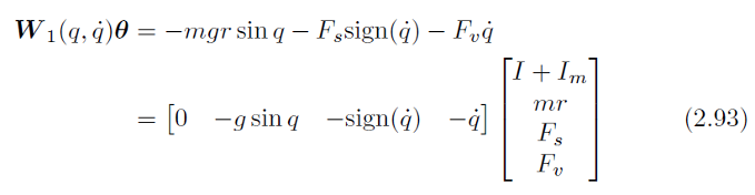 식 (2.46), (2.47)[각주:1]과 같은 2-링크 동역학 모델 식에 리그레서와 동역학 파라미터 벡터를 아래와 같이 분리할 수 있습니다.